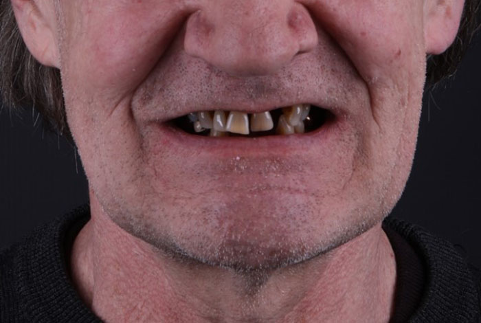 We discussed all suitable treatment options available, and we agreed upon the removal of all his remaining upper and lower teeth followed by replacement with six dental implants on each arch and a fixed twelve-unit bridge, known as All on Six Implant treatment.